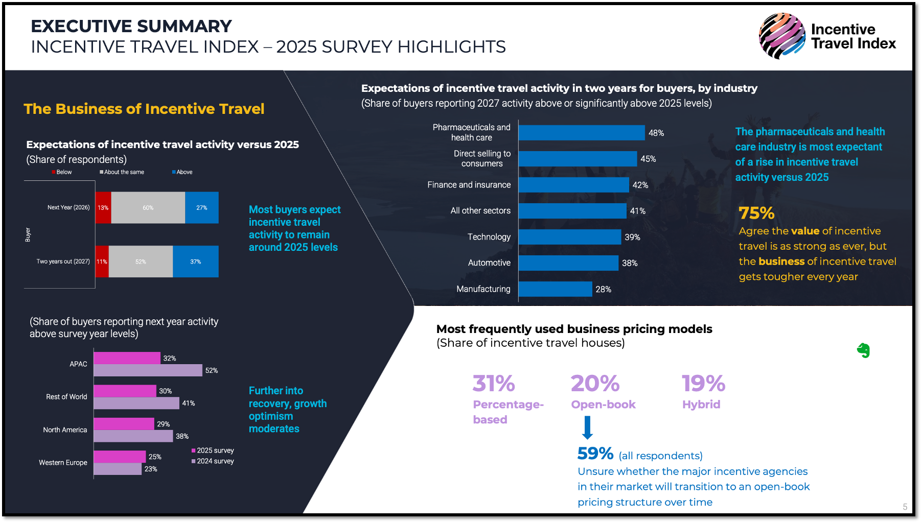 Regional differences are striking. APAC is the most optimistic, with 46 percent of buyers forecasting increased activity through 2027, compared with 32 percent in Europe. The pharmaceuticals, healthcare, and tech sectors show the highest confidence, seeing incentive programs as critical tools in talent retention and culture building.