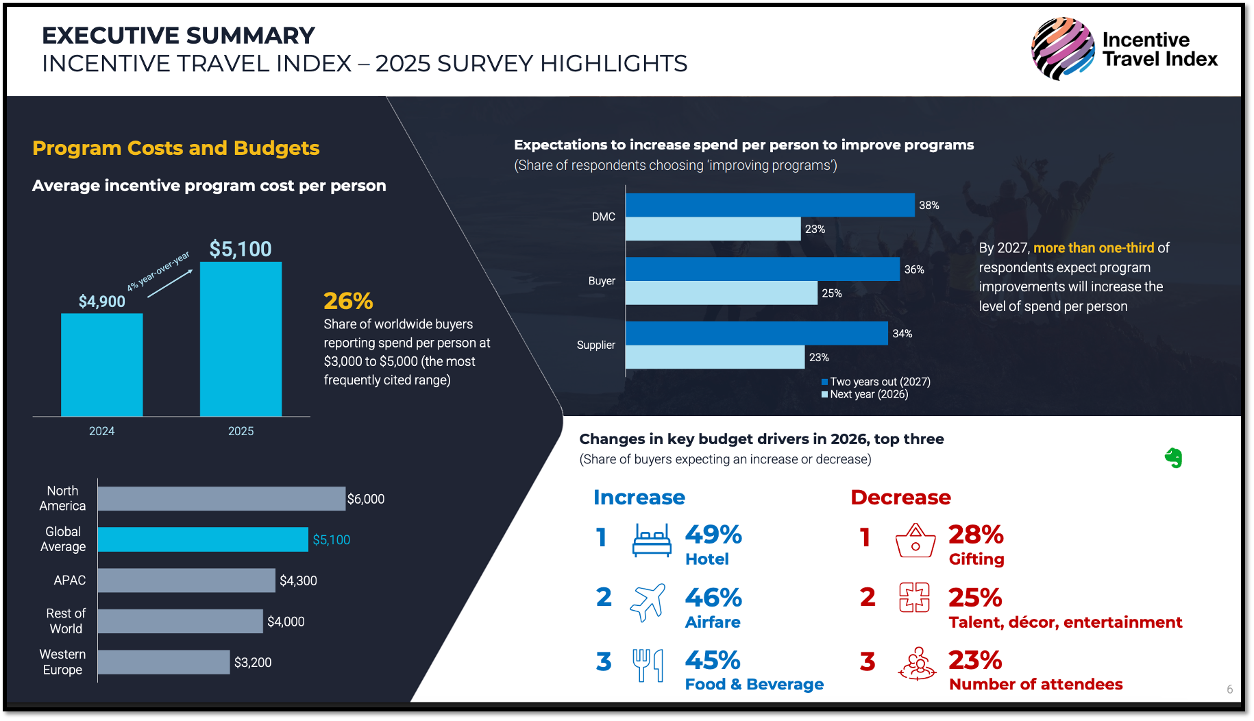 Average per-person spend has climbed to $5,100, up 4 percent year-on-year. North America leads with $6,000 per head, while Europe trails at $3,200 after a 20 percent drop. The global rise in hotel, air, and F&B costs, now accounting for nearly half of total program budgets, explains much of that increase.