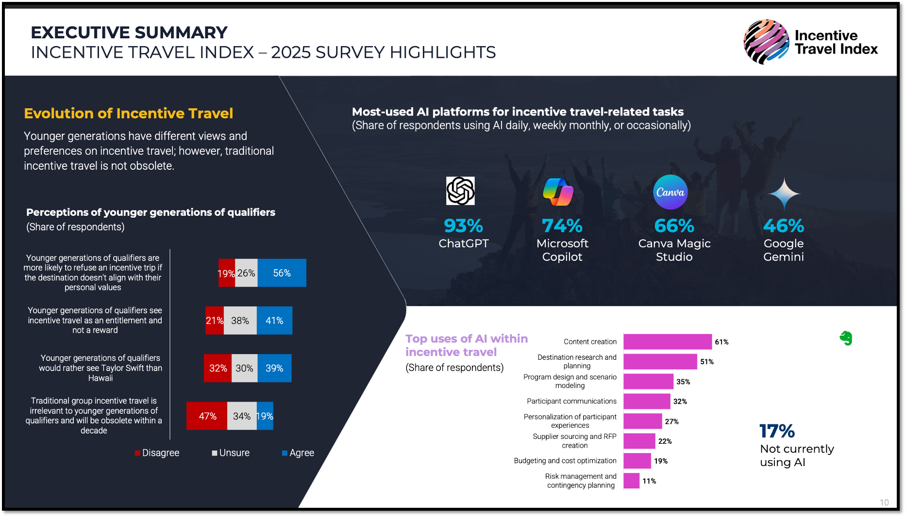 More than half say younger participants will decline trips that don’t align with their values. Forty-one percent believe this cohort views incentive travel as an entitlement rather than a privilege. And yet, nearly half (47 percent) disagree that group incentive travel is becoming obsolete. The future, it seems, belongs to programs that blend purpose with pleasure, reward with relevance.
