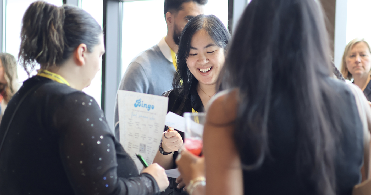 Among scheduled events was a social mixer that brought together 40 optometry students from Philadelphia with 25 young association members who had started their practices within the past five years. Held in an atrium with the resort’s signature African-themed décor and a glass wall overlooking the grounds, the event included an ice-breaker bingo game that encouraged people to circulate around the room to claim rewards.