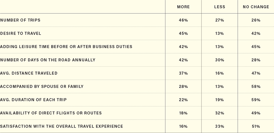Most significantly, 45% of respondents have more of a desire to travel now than five years ago, while only 13% of respondents have less of a desire to travel.