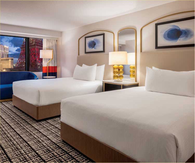 The new Versailles Tower and pedestrian bridge were recently added to Paris Las Vegas, which offers 3,667 guest rooms (756 rooms in the new Versailles Tower, including 38 balcony rooms). Huge guest rooms offer sweeping views of the Las Vegas Strip, and the new pedestrian bridge easily connects guests to all things Paris Las Vegas, including world-class dining and more than 150,000 square feet of meeting space.